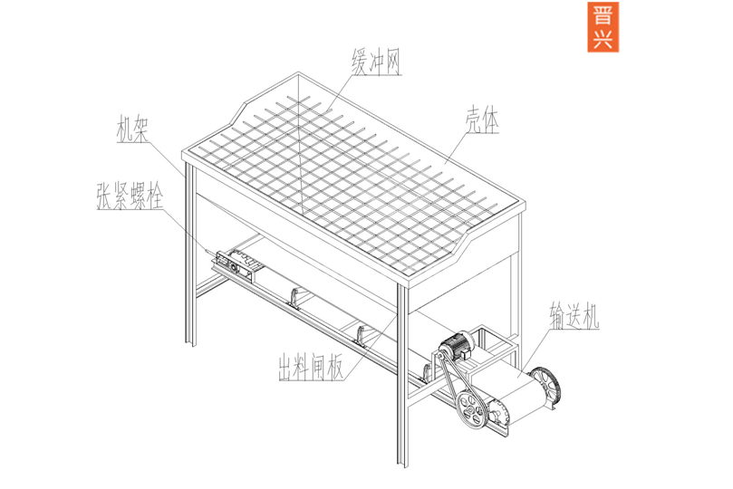 本產(chǎn)品作為物料加工過程中的原料倉使用,適用于鏟車裝填物料,出料時可實現(xiàn)勻速不間斷輸出,從而節(jié)省人工,提高工作效率。2.結(jié)構(gòu):該機由機架、殼體、緩沖網(wǎng)、輸送機組合而成。