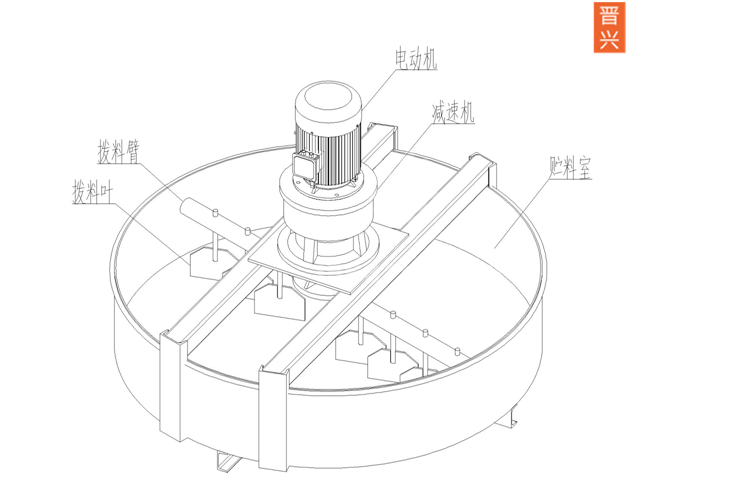 立式喂料機由盤體、撥料臂、機架、減速機、電動機等機構組成,其工作方式是通過電動機驅動減速機,然后帶動整個撥料臂勻速旋轉,從而使得交錯排列的撥料葉對物料進行均勻撥料。隨著撥料臂的旋轉從而使物料均勻流出。出料口可根據需要控制開啟大小以控制流量,以保證下道工序正常生產。