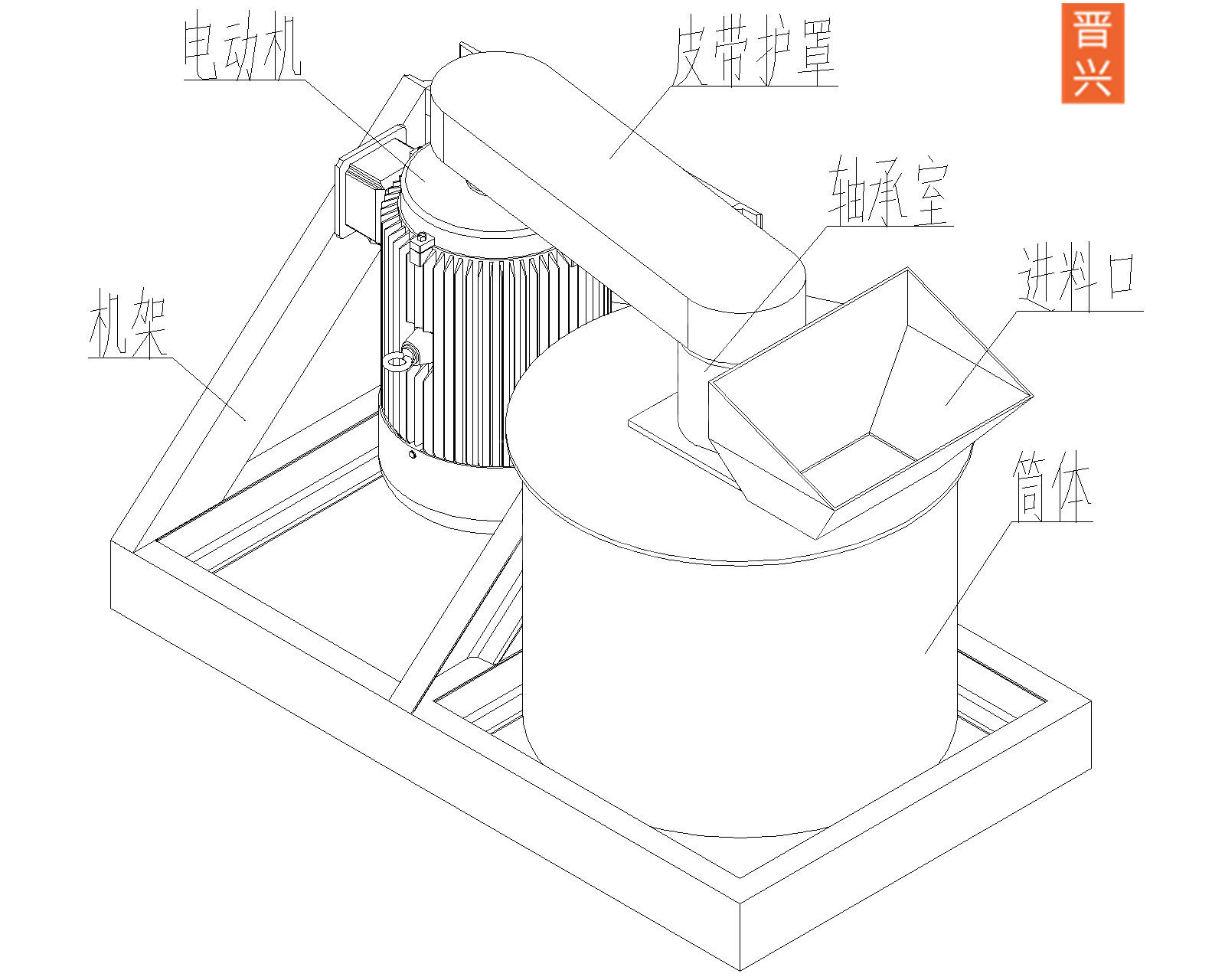 構(gòu)造組成:結(jié)構(gòu)由下機(jī)架、機(jī)殼、上下軸座、主軸、轉(zhuǎn)子盤、鏈條、錘頭、皮帶輪、電機(jī)架等部份組成。動(dòng)力經(jīng)三角帶帶動(dòng)主軸旋轉(zhuǎn),主軸有上下兩個(gè)軸承座,軸承座安裝在機(jī)殼的上端和下端。機(jī)殼總成安裝在下機(jī)架上,主軸上裝有轉(zhuǎn)子盤和鏈條,加料斗裝在機(jī)殼上部,為了裝卸錘頭方便,機(jī)殼上開有活門,便于拆裝維修。